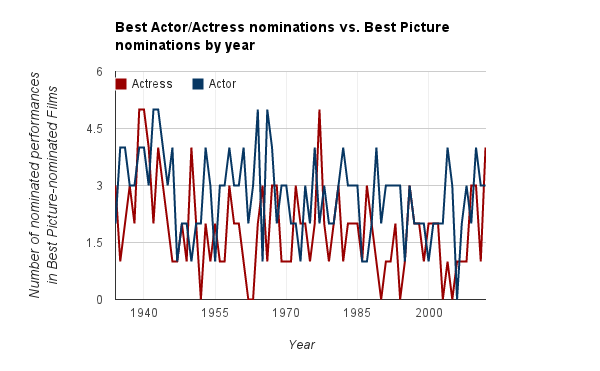 To sum up: Academy Awards nominees for Best Actor have been nominated for films also nominated for Best Picture to a much greater degree than the nominees for Best Actress. In years that have a wider field of Best Picture nominees, the disparity between actors and actresses narrows to the point it is not statistically significant. The disparity has also decreased in more modern years but remains statistically significant.