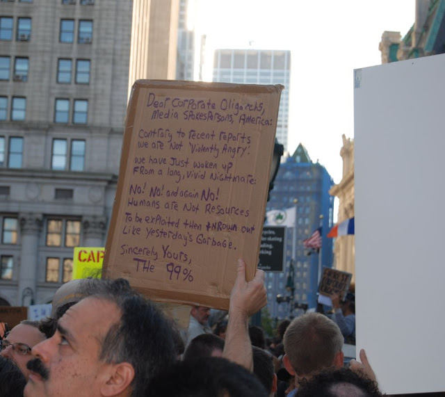 Now that the mainstream media finally wants to pretend-acknowledge the Occupy Wall Street movement, and its global impact (wait, are they pretend-acknowledging that yet?), I’m not surprised that much of its “coverage” centers around how the protesters aren’t united over a single issue, that they don’t have concrete demands, that they’re leaderless and unorganized. The reality is that the 1% owns the media too, and it’s in the best interest of the 1% to keep this movement from gaining momentum, lest its constituents suffer actual tangible consequences for their thievery. So, they get their media to make Occupy Wall Street about how young liberals are just pissy that Obama isn’t as hopey-changey as they’d hoped; or they get their media to say that those clueless Wall Street kids don’t have any real goals so this can’t be a real thing that we need to pay real attention to; or—their most effective tactic—they get their media to start comparing and contrasting Occupy Wall Street and the Tea Party as if this movement is just the eruption of another political fringe group with an exclusively left-wing agenda, rather than what it is: A Call to Action for those of us who don’t get to throw down a cool million here and there and call it “speech.”
